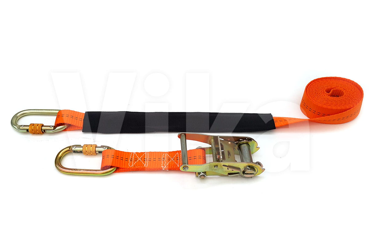 Pas do mocowania motocykla to pas dwuczęściowy o całkowitej długości 4m (3.75m część długa + 0.25m część z napinaczem) do którego dodaliśmy rękaw ochronny oraz zatrzaśniki zamiast standardowych haków. Napięte pasy podczas transportu wykonują mikroruchy, dlatego dzięki rękawowi ochronnemu pas przeciągnięty np. na baku nie uszkodzi ani nie porysuje delikatnej, lakierowanej powierzchni. Pasy zakończone są zatrzaśnikami.