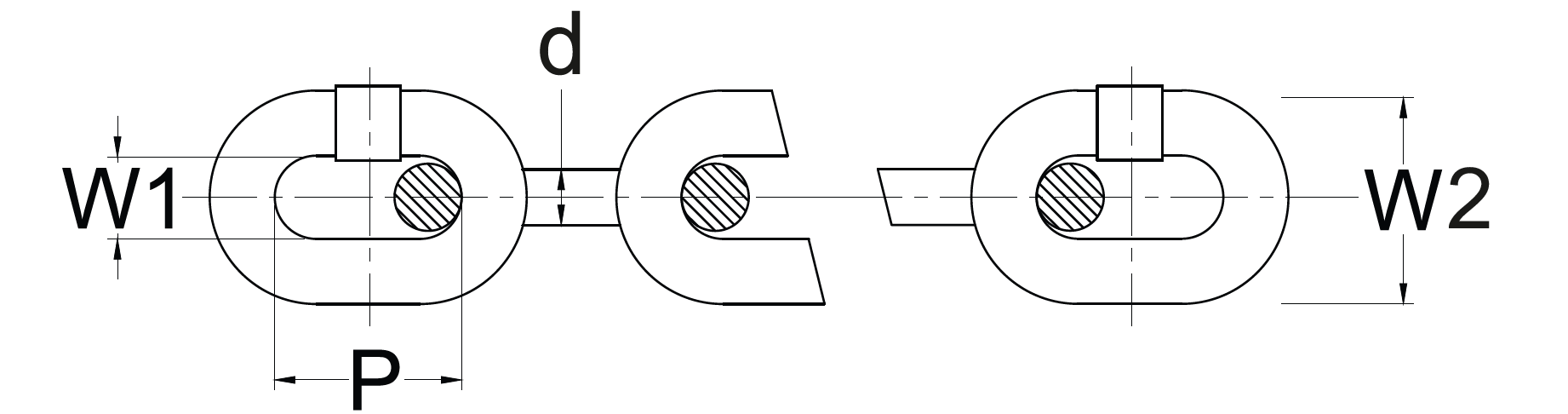 | średnica ogniwa | Wytrzymałość (WLL) | d | P | W1 | W2 | Waga kg/m |