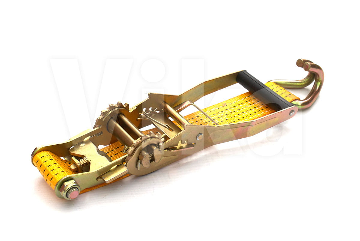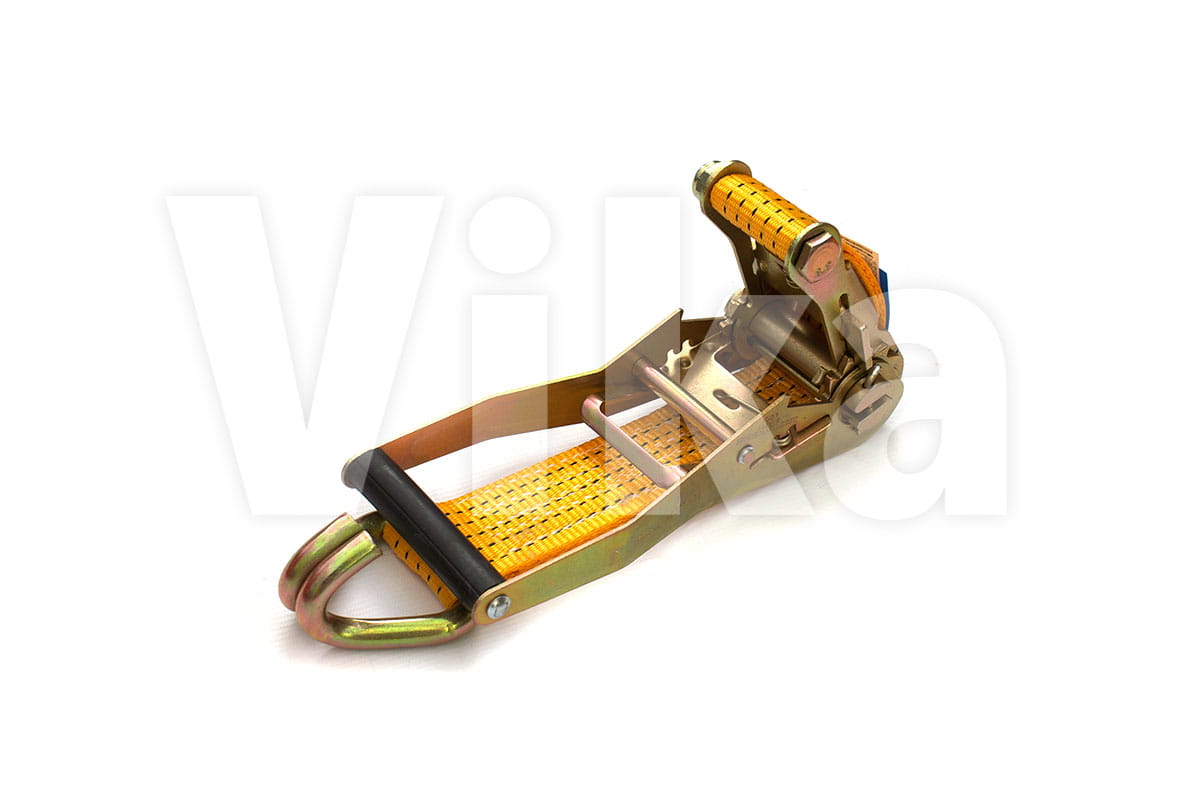 Napinacz składa się z mechanizmu (nazywamy go również grzechotką) do którego przymocowany jest krótki pasek zakończony hakiem. Do żółtej taśmy 50 mm wszywamy standardowy hak 1006 (atest na 2,5 tony). Całość ma standardową długość 0.5 metra. Na zamówienie możliwe jest wszycie krótszych lub dłuższych pasków.