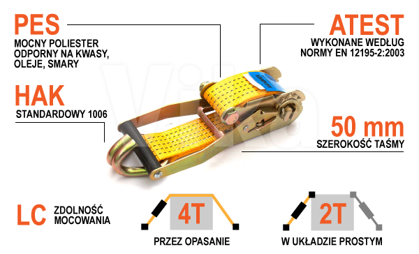Poniżej w skrócie przedstawiamy najważniejsze parametry napinacza do pasa 50 mm 4 tony: