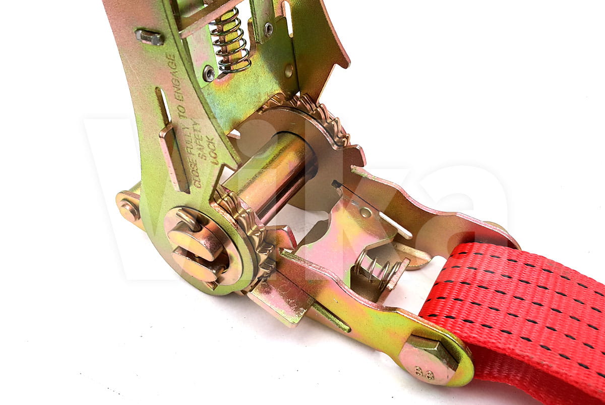Napinacz składa się z mechanizmu (nazywamy go również grzechotką) do którego przymocowany jest krótki pasek zakończony hakiem. Do czerwonej taśmy 50 mm wszywamy standardowy hak 1006 (atest na 2,5 tony). Całość ma standardową długość 0.5 metra. Na zamówienie możliwe jest wszycie krótszych lub dłuższych pasków.