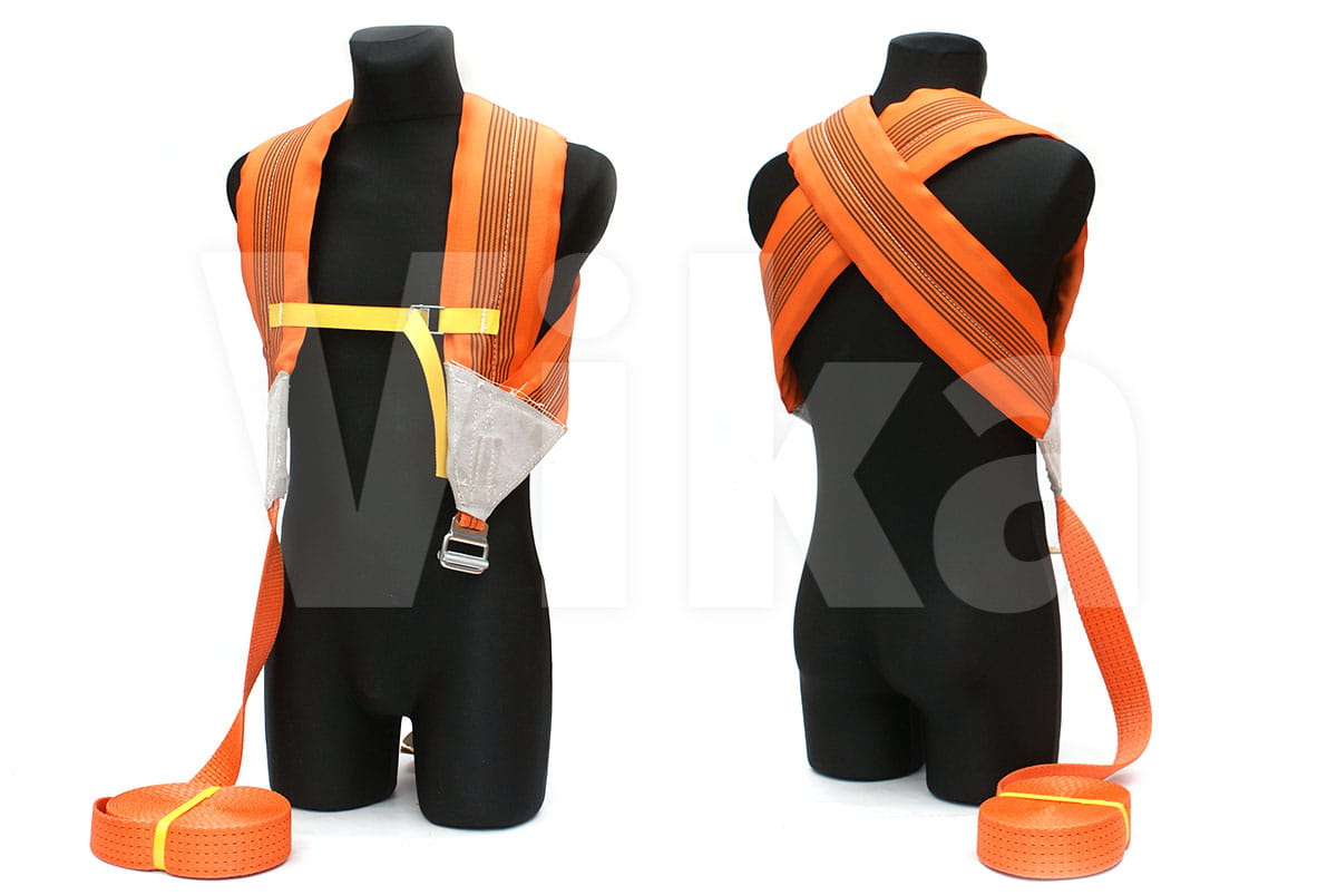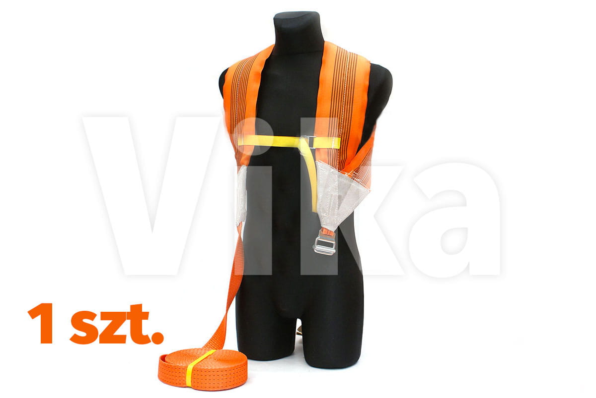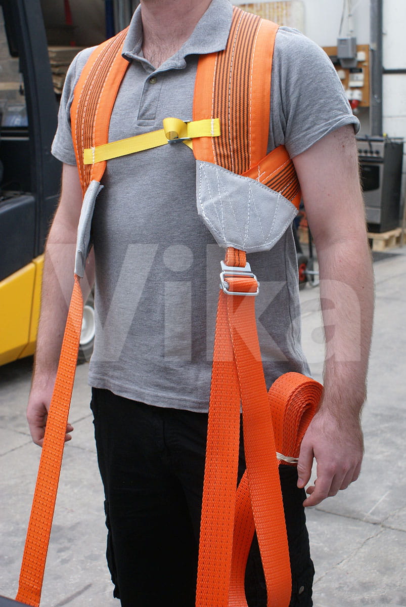 Jedna uprząż składa się z zakładanych na plecy szelek (uprzęży) oraz doszytego pasa nośnego, na którym umieszcza się podnoszony przedmiot. Szelki uszyte są z dwóch krzyżujących się na plecach bardzo szerokich taśm. Podnoszony ciężar rozkłada się na całą powierzchnię szelek co zapewniaj wysoki komfort noszenia. Absolutnie nic się nie wżyna! Dodatkowo szelki posiadają z przodu krótki pasek ściągany klamrą szybkomocującą (żółty element), która utrzymuje szelki w odpowiednim miejscu i nie pozwala im się zsunąć z ramion.