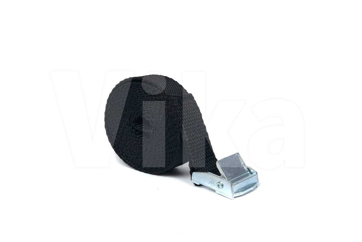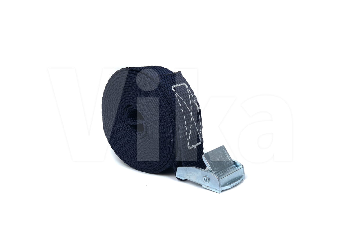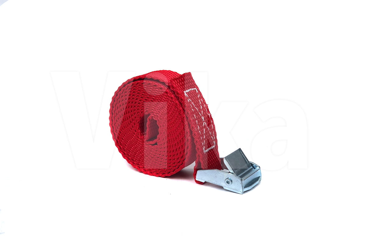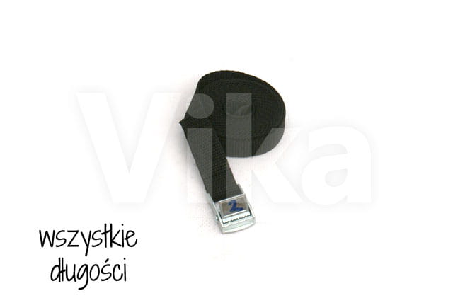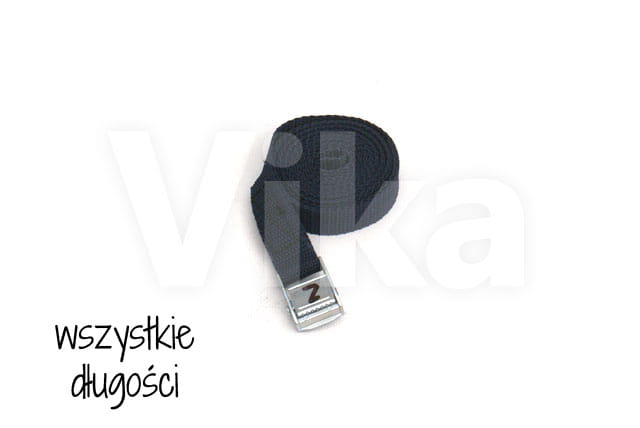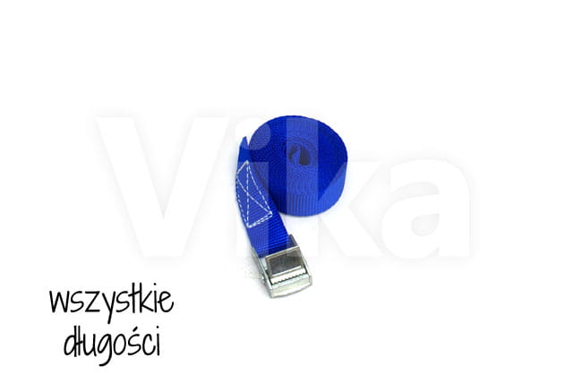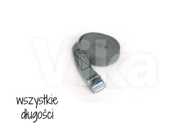 Pas zbudowany jest z taśmy z włókien polipropylenowych (PP) o szerokości 20 mm. Wytrzymałość taśmy na zerwanie to 280 kg. Wytrzymałość klamry jest o wiele mniejsza i wynosi około 100 - 150 kg, dlatego pasy ściągające radzimy stosować przy maksymalnym obciążeniu 100 kg.