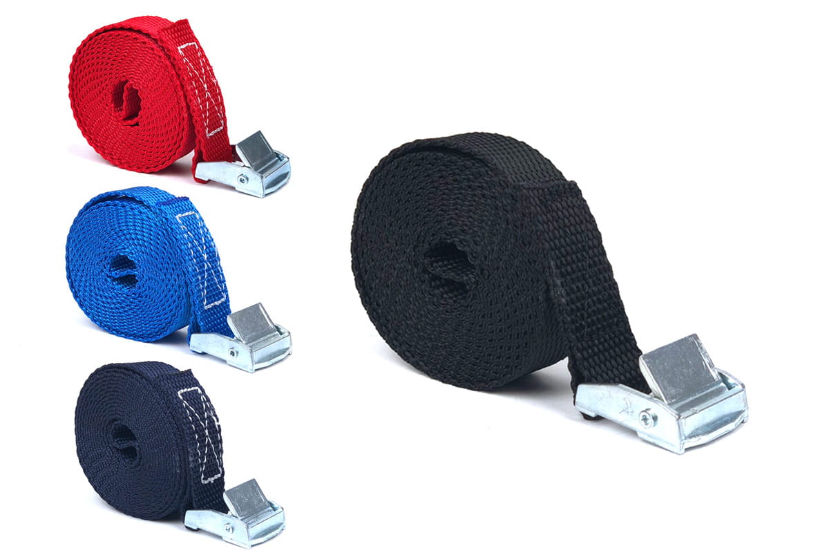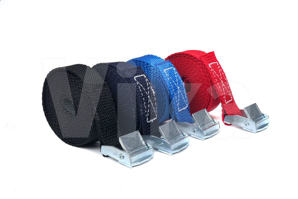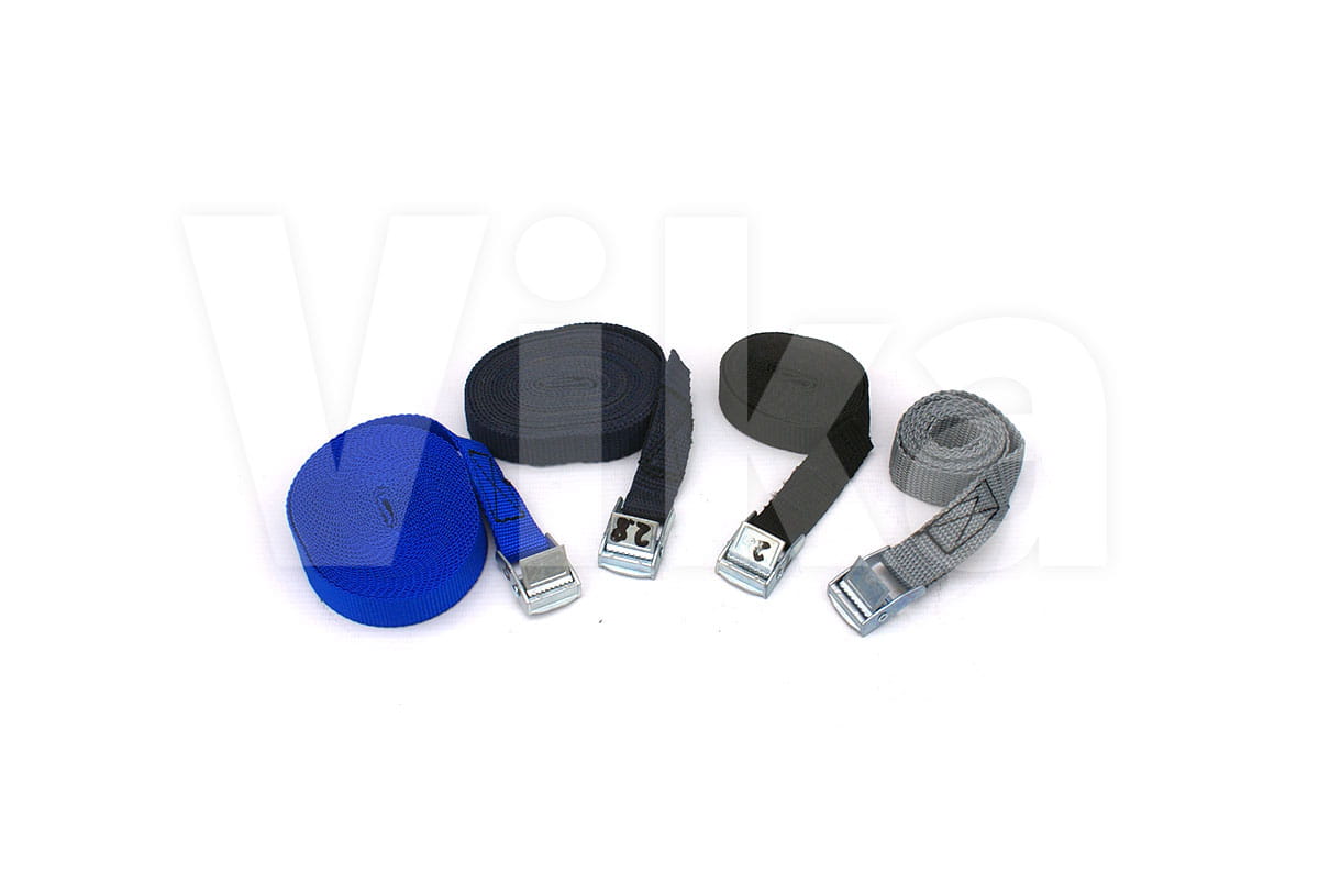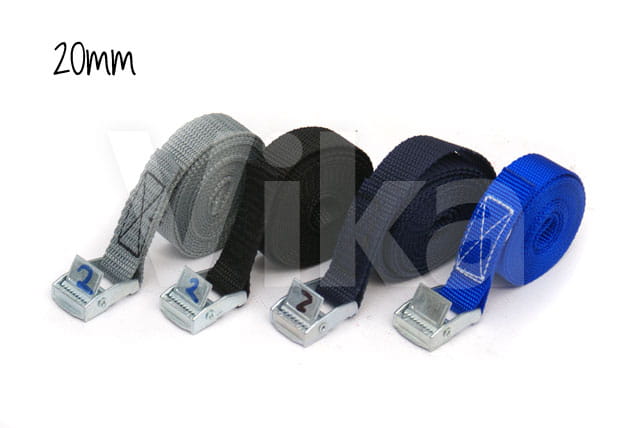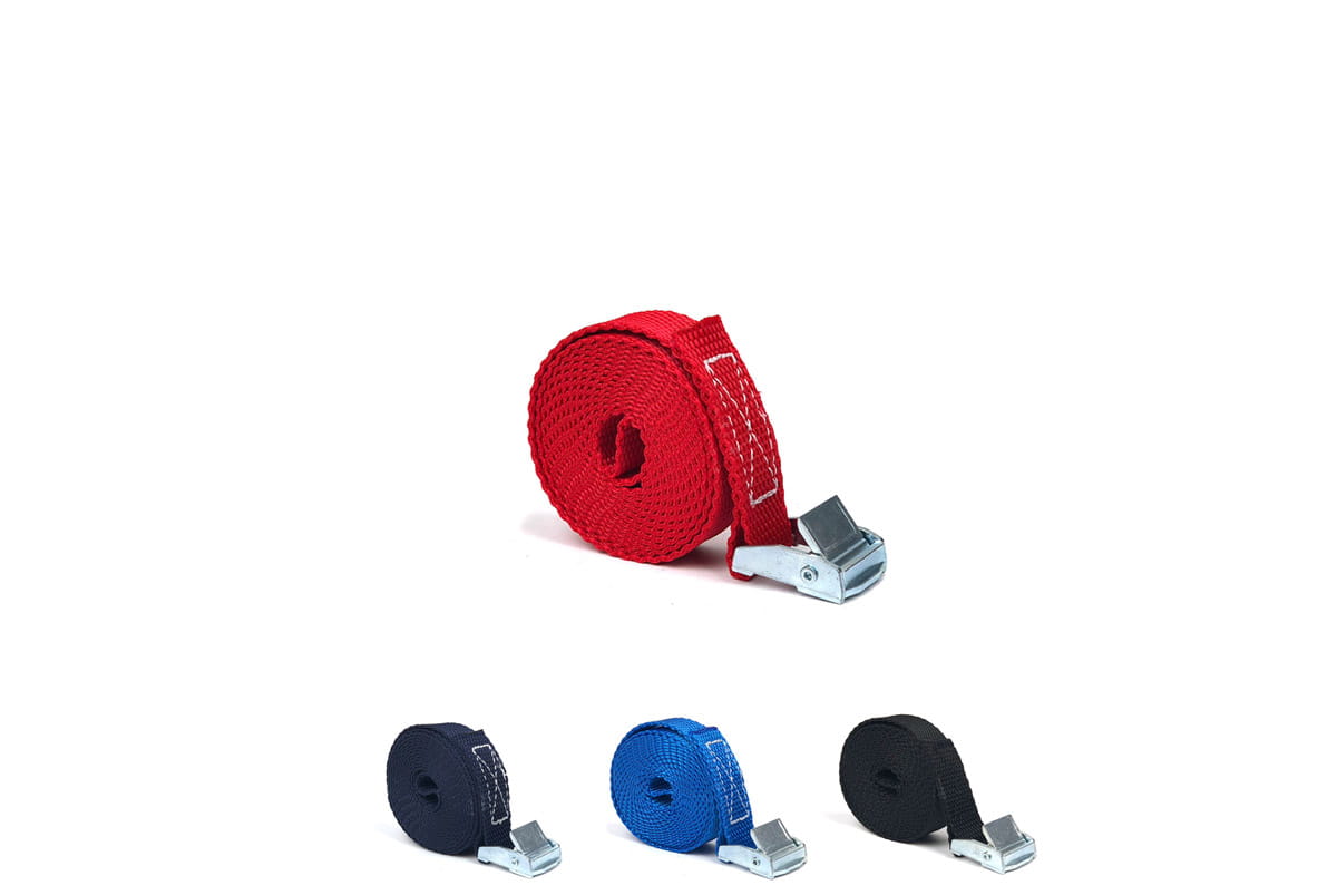Pas zbudowany jest z taśmy z włókien polipropylenowych (PP) o szerokości 20 mm. Wytrzymałość taśmy na zerwanie to 280 kg. Wytrzymałość klamry jest o wiele mniejsza i wynosi około 100 - 150 kg, dlatego pasy ściągające radzimy stosować przy maksymalnym obciążeniu 100 kg.