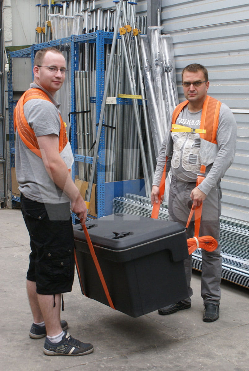 Komplet składa się z dwóch sztuk uprzęży (szelek) z taśmami nośnymi! Do użycia pasów do podnoszenia mebli potrzebne są dwie osoby (chociaż można je również rozdzielić i stosować osobno). Równolegle ustawione pasy podsuwa się pod podnoszony przedmiot a następnie reguluje się ich długość. Po odpowiednim ustawieniu pasów przedmiot można podnieść a następnie przenieść w odpowiednie miejsce.