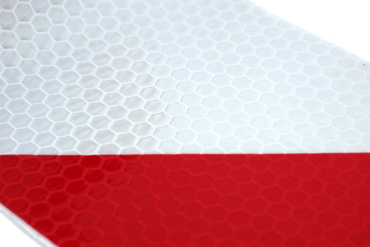 Taśma odblaskowa 3M samoprzylepna koloru biało-czerwonego do oznakowania pojazdów specjalnych. Taśma odblaskowa ma strukturę plastra miodu. Taśma sprzedawana na metry lub w całym krążku.