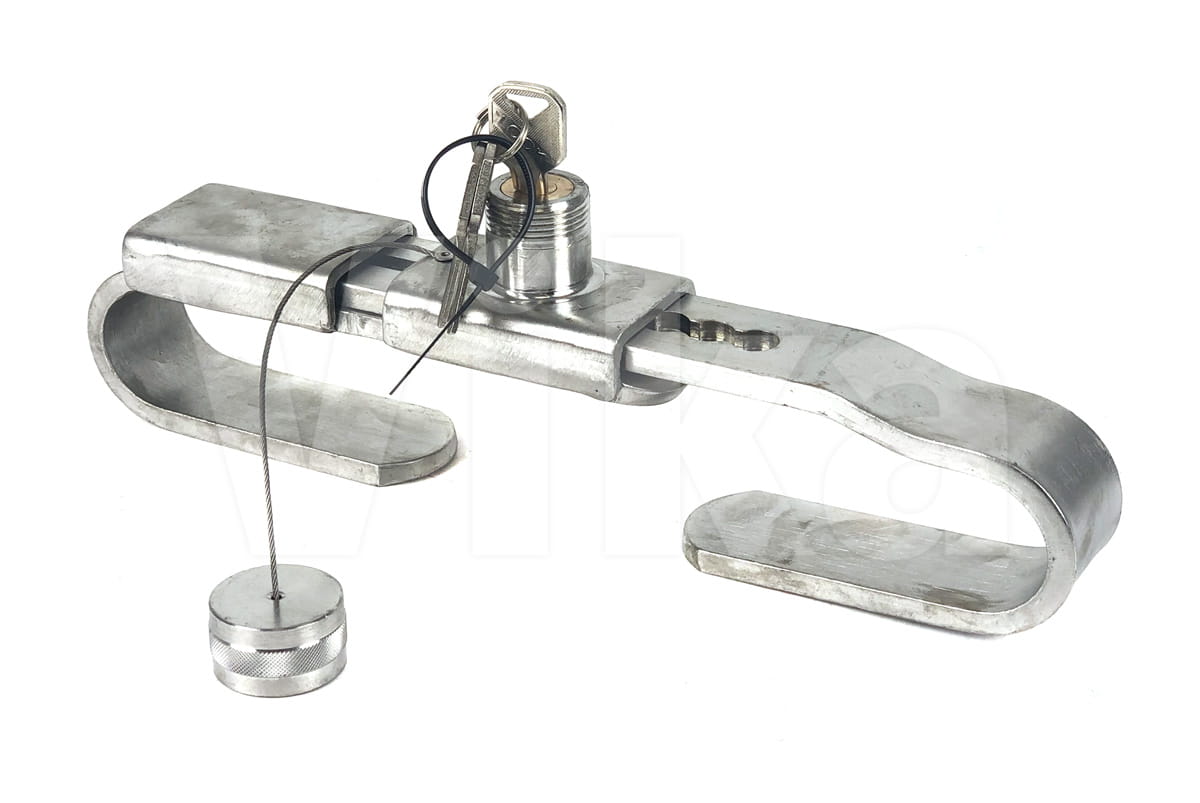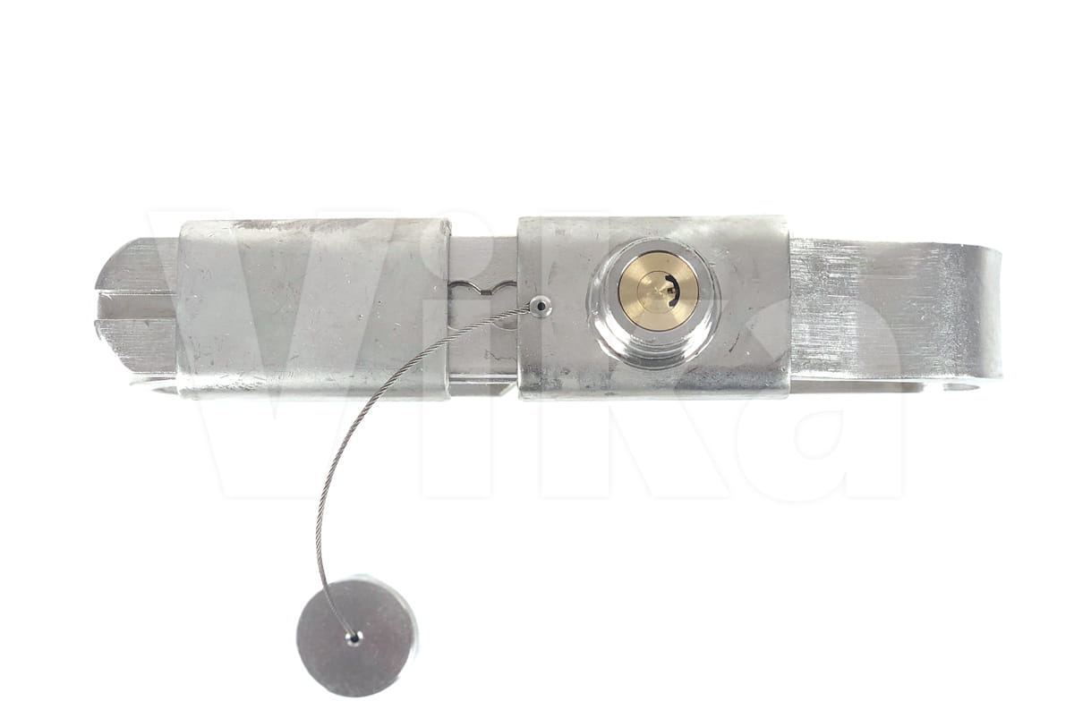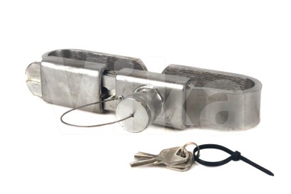 Stalowy, dwuczęściowy, rozsuwany rygiel do blokady drzwi kontenerowych przed włamaniem. Jest to uniwersalne zamknięcie drzwi kontenera, które nada się do drzwi z pionowymi prętami. Jest to mocne zabezpieczenie przed niepożądanym włamanie do środka naczepy.