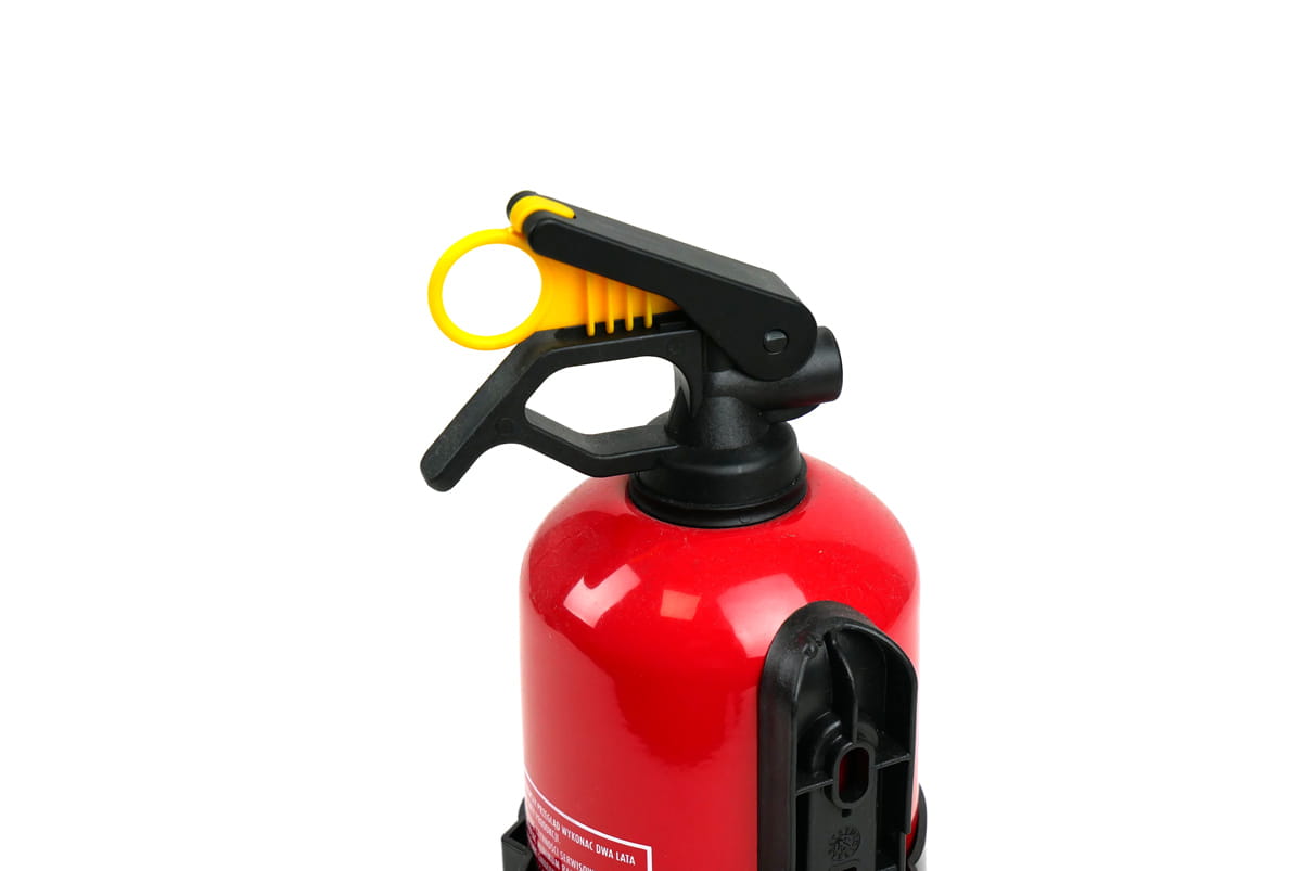 Mała gaśnica proszkowa w komplecie z wieszakiem idealna do zabezpieczenia samochodów osobowych, przyczep kempingowych, łodzi motorowych i żaglowych.