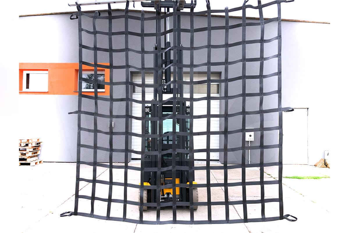 Siatka na tor przeszkód wykonana została z taśmy poliestrowej (PES) 50mm w kolorze czarnym. Taśma poliestrowa charakteryzuje się wysoką wytrzymałością na zerwanie wynosząca aż 6 tony oraz odpornością na skrajne warunki atmosferyczne. Krzyżujące się kawałki taśmy połączone się podwójnym szwem dzięki czemu tworzą mocną konstrukcję. Połączone taśmy tworzą oczko o wymiarach 20 cm na 20 cm.