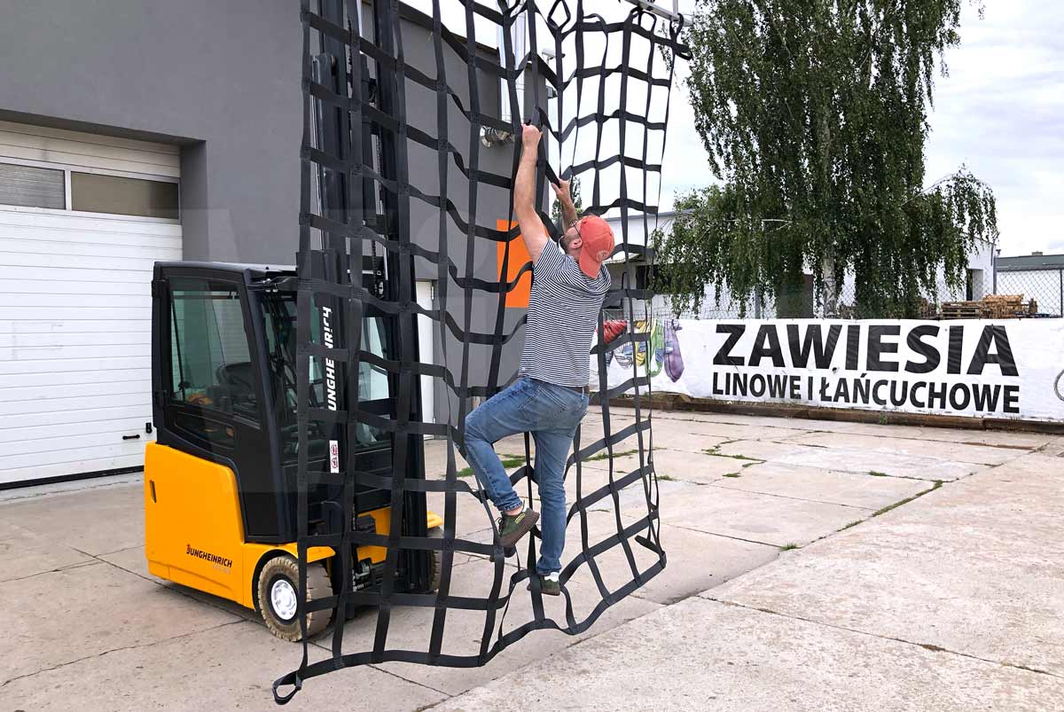 Siatka zabezpieczająca przystosowana do wielokrotnego wykorzystywania na torach przeszkód. Została przystosowana do elementów konstukcyjnych do jakich zostanie przyczepiona.