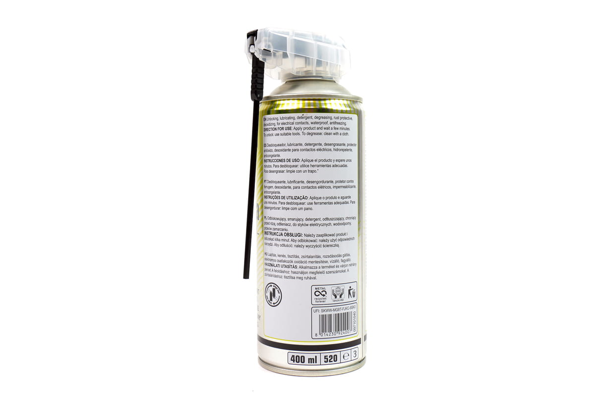 Płynny smar wielofunkcyjny 7w1 400 ml o szerokiej możliwości użycia. Preparat wyposażony w specjalny zawór pozwalający na dozowanie smaru gdy pojemnik jest odwrócony do dołu. Dodatkowo, opcjonalnie zastosowano ruchoma rurkę, która pozwala na dostarczenie preparatu do trudno dostępnych miejsc.