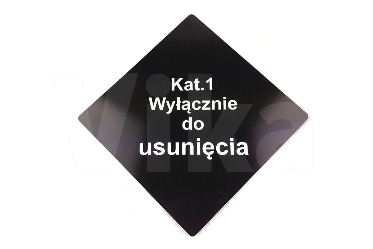 Tablica informacyjna w kolorze czarnym z białym napisem - "KAT 1 wyłącznie do usunięcia" spełnia wymogi Rozporządzenie Parlamentu Europejskiego i Rady Nr 1069/2009 z dnia 21 października 2009 r.