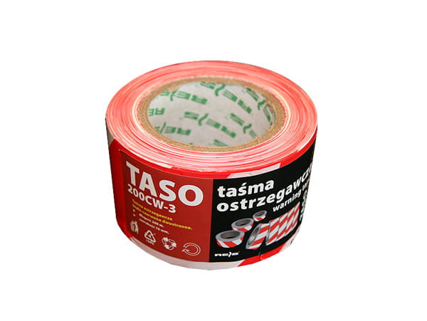 Taśma ostrzegawcza biało-czerwona dwustronna. - długość: 2 00 m - szerokość: 70 mm - grubość: 30 mic