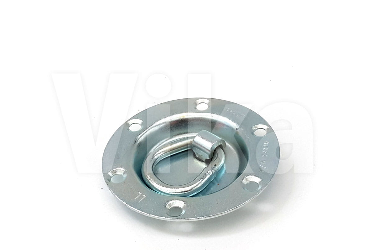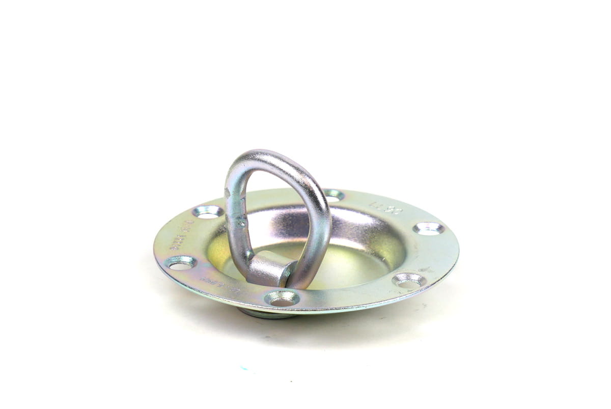 Uchwyt podłogowy, z obrotowym uchem. Wymiary: Średnica 89mm. Odległość otworu od otworu 38mm Grubość pręta z którego wykonane jest oczko 6mm. Wytrzymałość 1360kg